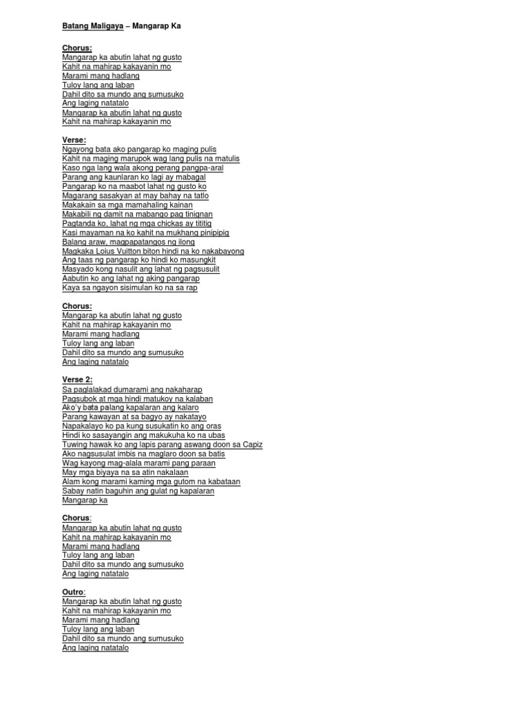 Posted by vanilla on Tuesday 23 December 2008. Feb 02 2013 Pangarap koy hindi modernisasyon kundi preserbasyon Pangarap koy hindi artipisyal na ganda kundi natural na biyaya Pangarap koy di kasaganahan kundi pagkamaparaan at pagkakontento Pangarap ko ay Pilipinas hindi ibang bansa para sa Pilipino. Ito ang mga matigas na katanungan.